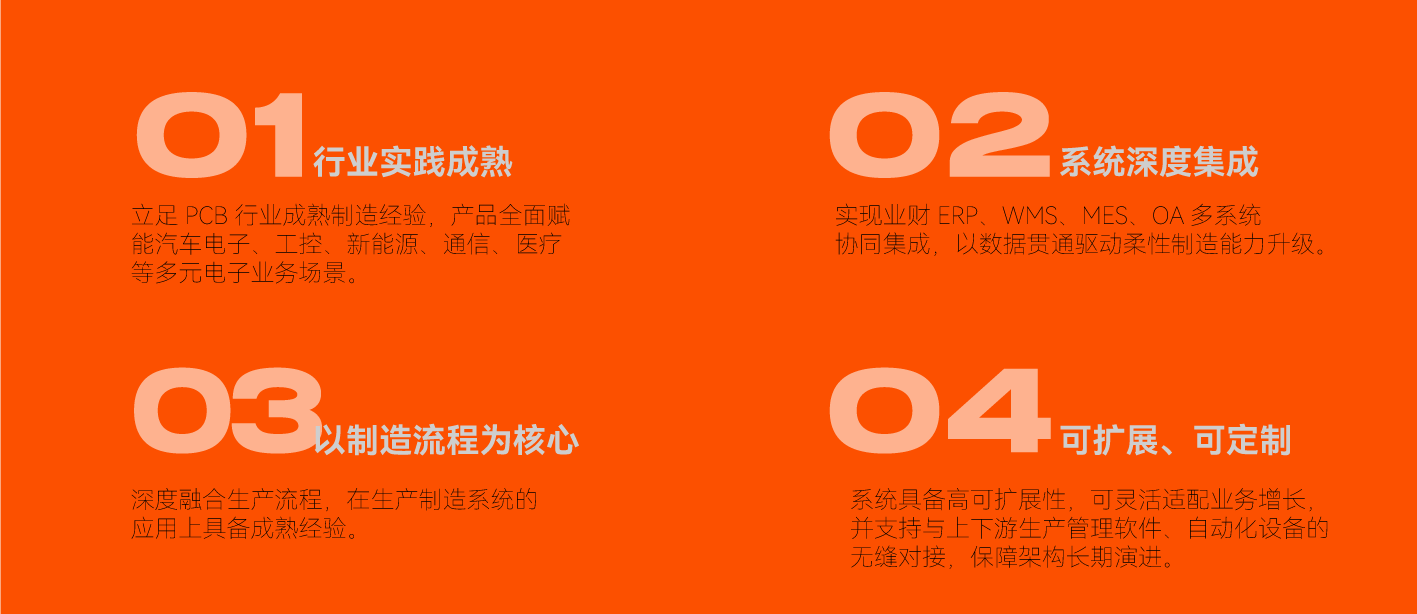 PCB制造專屬MES 系統(tǒng),構(gòu)建業(yè)務(wù)流、信息流、數(shù)據(jù)流三流協(xié)同統(tǒng)一的核心架構(gòu),通過WIP 精準(zhǔn)管控、流程防呆、數(shù)據(jù)深挖三大關(guān)鍵能力,破解行業(yè)核心痛點(diǎn)。系統(tǒng)無縫集成用友業(yè)財ERP與 OA 系統(tǒng),打通端到端業(yè)務(wù)鏈路,助力生產(chǎn)管理完成數(shù)字化轉(zhuǎn)型,實現(xiàn)高效協(xié)同與精準(zhǔn)管控。